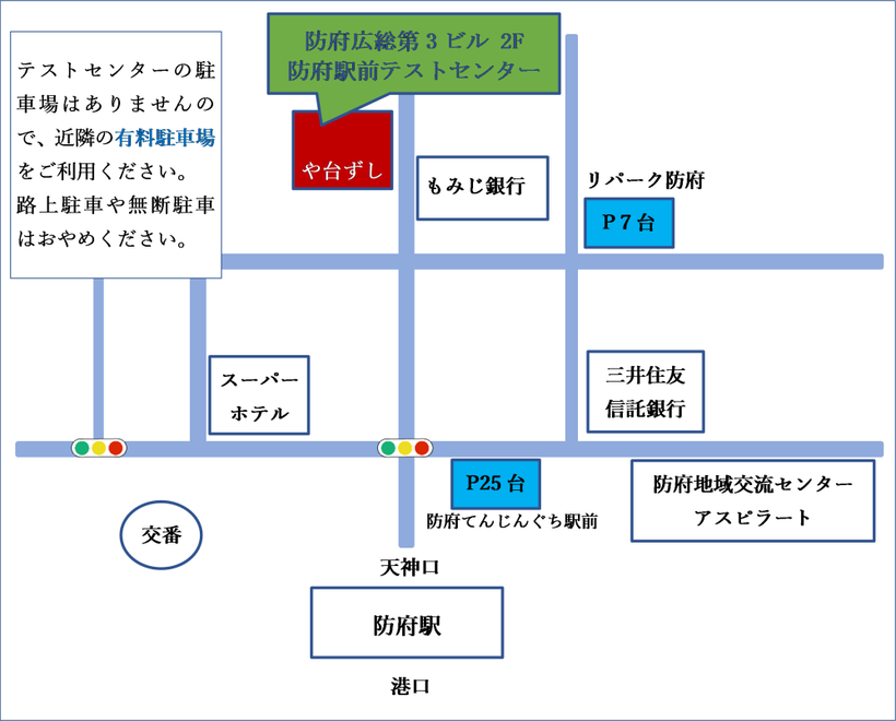 試験会場交通アクセス 試験会場のご案内 試験会場の場所を検索される場合、住所でご確認下さい。 電話番号で検索すると右田本店が表示される場合がございます。 試験会場外観 所在地 山口県防府市戎町1-8-25 防府広総第3ビル 2F (防府駅より徒歩3分) 電話番号 0835-25-3138 駐車場について 駐車場は完備しておりませんので、お車でお越しの方は最寄りの有料駐車場をご利用ください。 試験会場近辺の地図